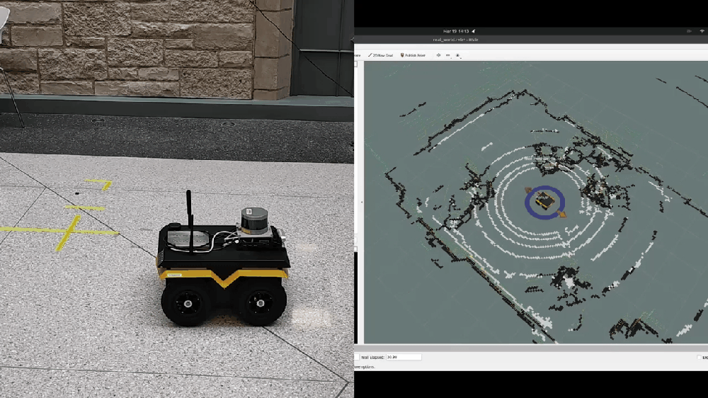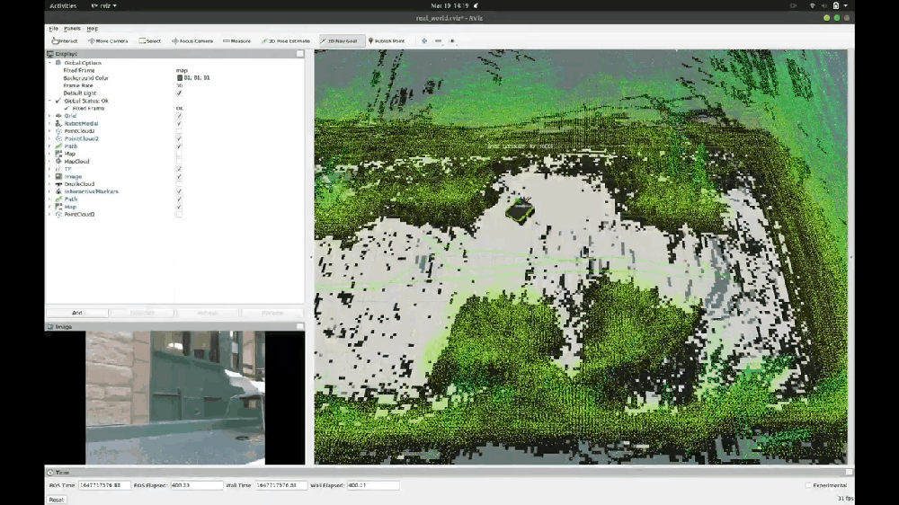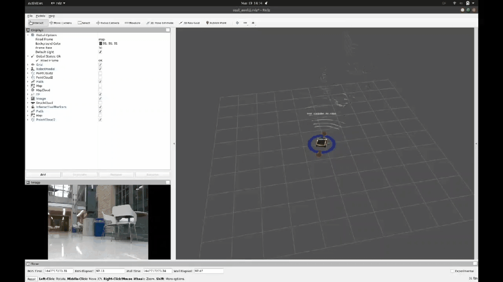 The navigation stack is accomplished by the move base ROS package, which links together a global and local planner and publishes a twist control message to move the robot to the desired goal position. The move base works better when the robot has a more certain grid map. The following gif shows that the robot is implementing a navigation stack. Also, the move base package has many configuration parameters; good navigation requires a lot of tunning of those various parameters.