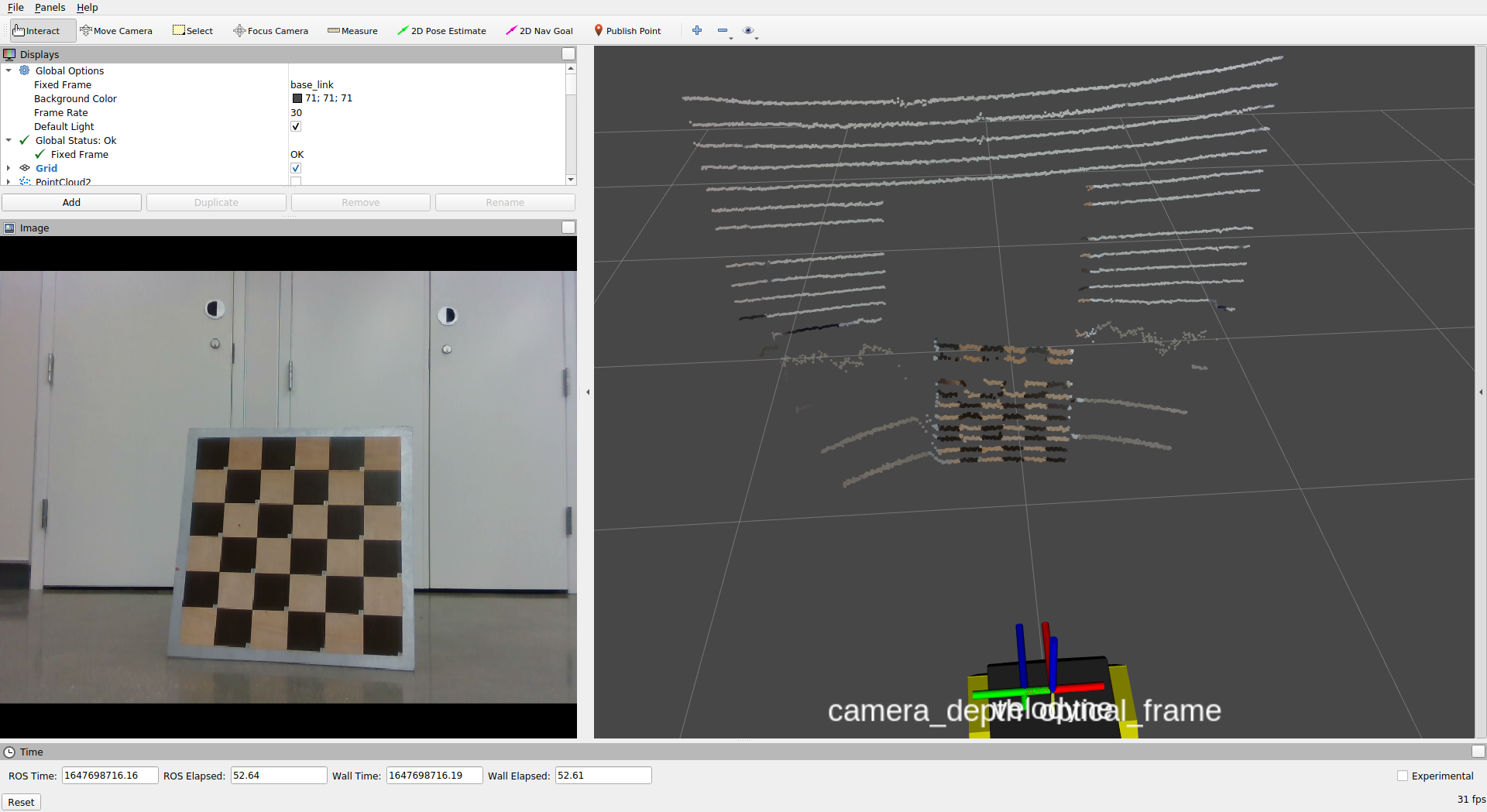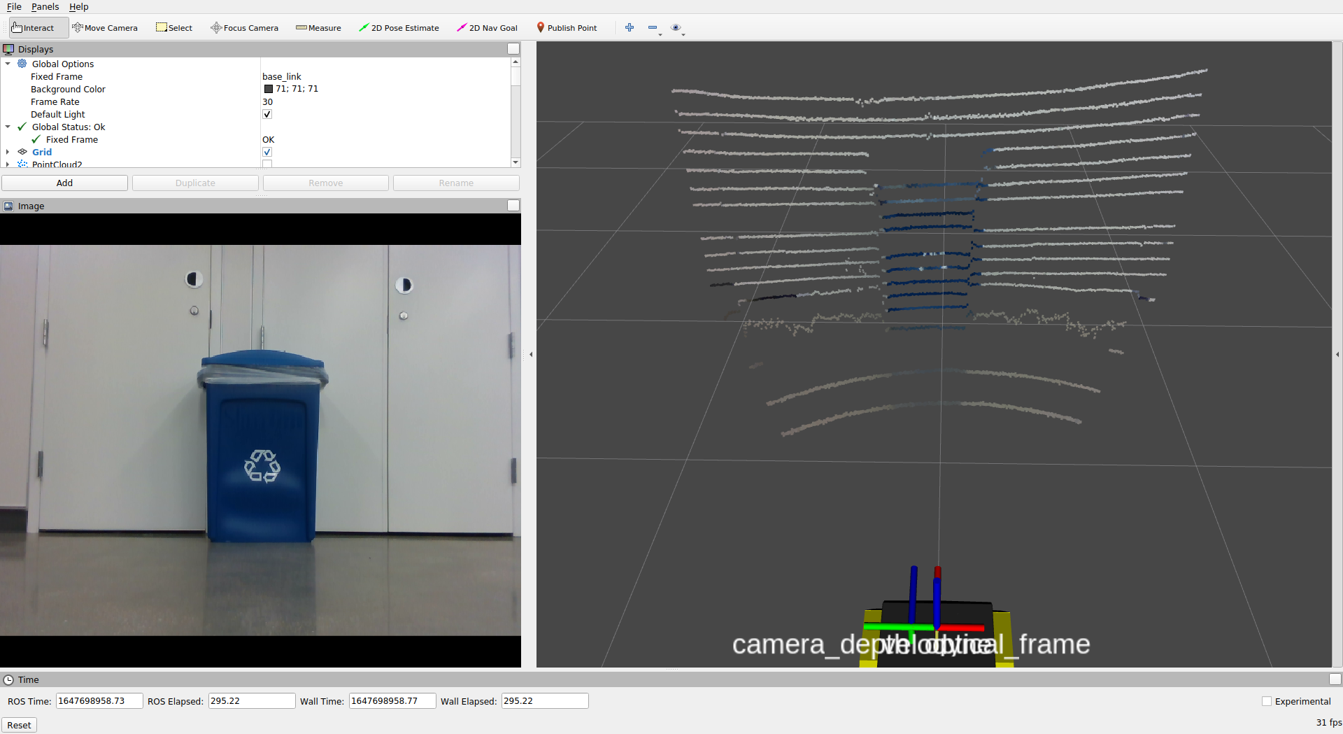 After the point cloud coordinates have been mapped to the pixel coordinates in the camera plane, a threshold is set to obtain only the point that the camera’s field of view can receive. The RGB values are then added to those point clouds and published as XYZRGB point clouds in the camera frame.