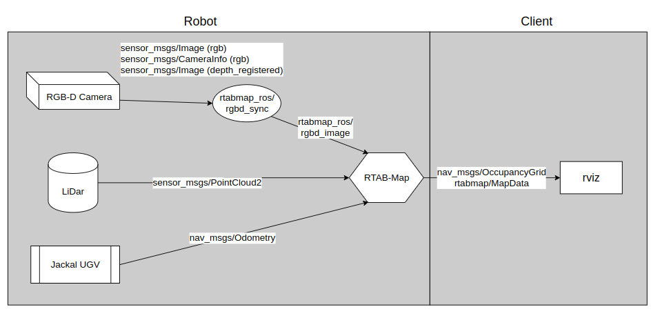 The Jackal robot is equipped with a LiDar and an RGB-D camera. The Lidar provides 3D point cloud messages to the mapping algorithm, while the camera provides both RGB images and depth-registered images. The flow chart below shows our configuration’s important messages used in rtabmap.